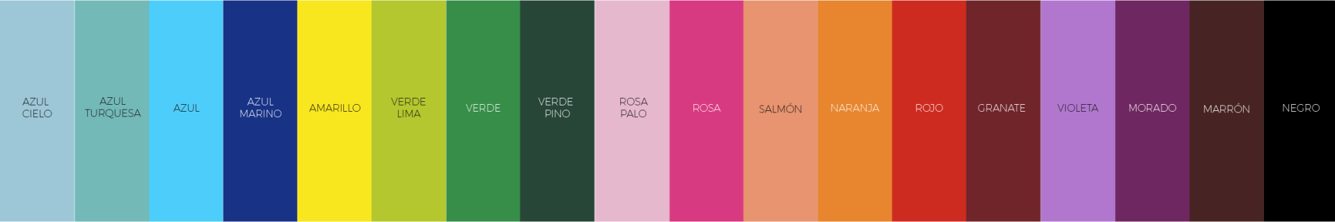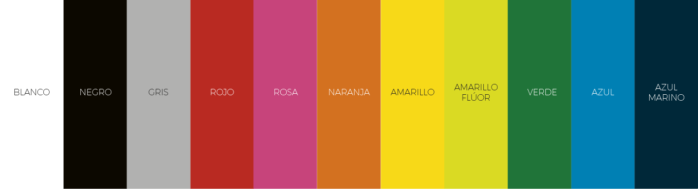 Los colores base pueden ser (poliéster brillante): BLANCO, NEGRO, GRIS, ROJO, AMARILLO, VERDE, AMARILLO FLÚOR, NARANJA, ROSA, AZUL o AZUL MARINO.